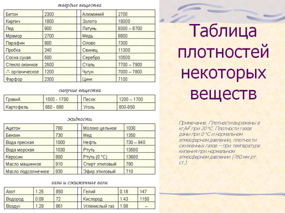 Щільність речовин можна подивитися в загальноприйнятих таблицях. Ось одна з таких таблиць, якою користуються будівельники та інші фахівці: