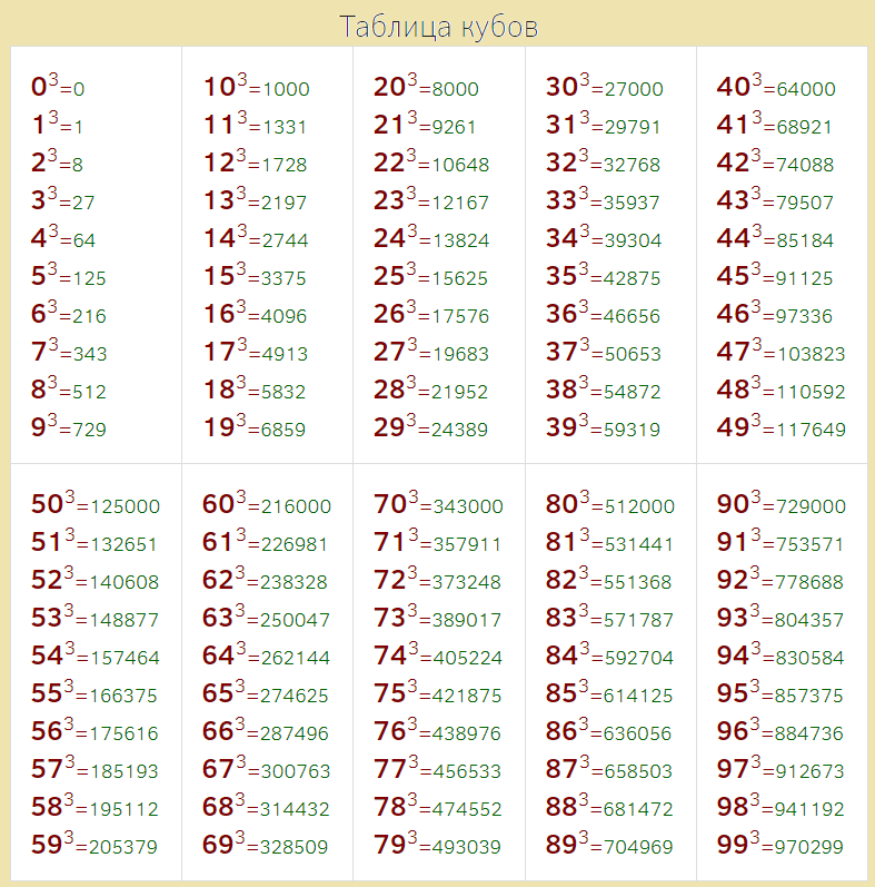 Таблиця кубів допоможе вам швидко підрахувати ті чи інші значення. Роздрукуйте таку таблицю або зробіть фото на телефоні, щоб вона завжди була під рукою.