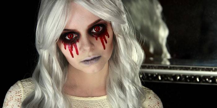 - використовуючи червону фарбу, зробіть криваві патьоки від нижнього століття до вилиць;
