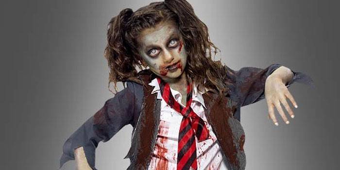 Ще одним улюбленим персонажем дітей на Хеллоуїн вважається зомбі. Істотним достоїнством способу ходячого мерця є те, що він підходить як для хлопчиків так і для дівчаток. Виконати макіяж дитина може самостійно – це самий легкий грим на Хеллоуїн. Основу образу зомбі становить бліде або сіре обличчя. Етапи створення: