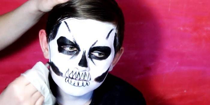 Один з найбільш доречних образів на Хеллоуїн – скелет. Він у багатьох культурах уособлює собою смерть. Малювання незвичайного скелета займає багато часу – дитина не зможе зробити такий макіяж. Основні кольори – чорний і білий, хоча можна використовувати і інші за бажанням. Для роботи більше підійде аквагрим, безпечний для шкіри. Етапи: