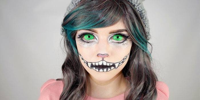 Часто дівчата на Хеллоуїн обирають образ милої кішечки або тигреня. Не менш популярний в це свято макіяж Чеширського Кота – персонажа з казки Льюїса Керролла «Аліса в Країні чудес». Найскладніше в створенні образу – це посмішка. Для казкового макіяжу знадобляться: