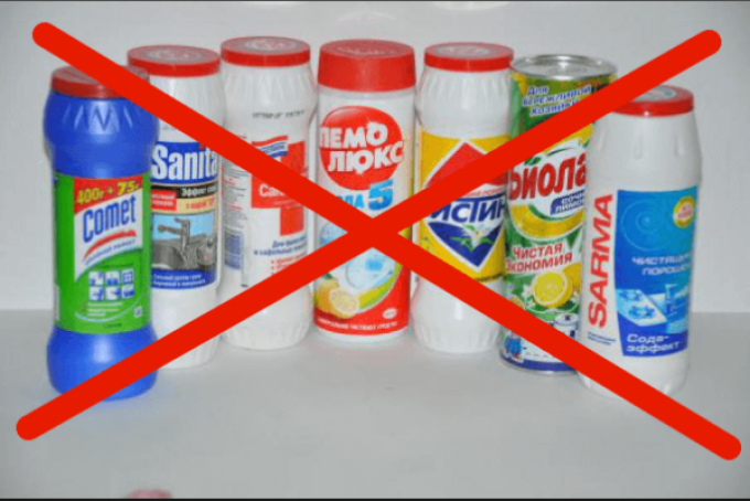 Не варто використовувати такі порошки, як «Пемолюкс», «Біолан» або «Comet». Перш за все, в них містяться абразиви, а ще їх треба втирати. Так що краще користуватися рідкими засобами або пастами. Вони не зашкодять поверхні. Тільки працювати з ними треба в рукавичках, так як склад часто агресивний.