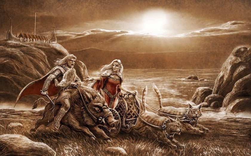- Фрейя панує над родючістю, красою і любов’ю. Її тотем – кішка, саме вони запряжено в її колісницю. Є дочкою Ньерда і сестрою Фрейра. В хлібні зерна звертаються золоті сльози, капаючі з її очей, коли вона в тузі розшукує свого чоловіка Ода, відає вітром.