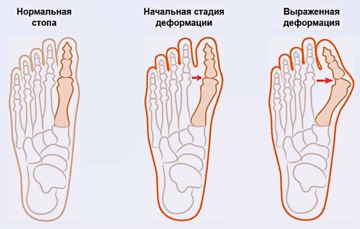 - Плосковальгусная деформація стопи. Захворювання, зване подагру, «кісточкою на нозі». Це зміщення великих пальців ніг всередину, при цьому вони різко втрачають рухливість, болять.