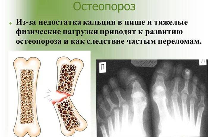 - Остеопороз. Зменшення кісткової тканини, підсилює крихкість кісток. Викликається дефіцитом кальцію і фосфору.