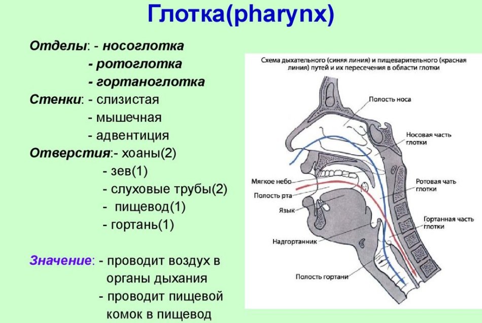 Глотка і гортань знаходяться поруч, у них схожі функції і вони беруть участь в процесі поглинання їжі, дихальному процесі разом. Розберемо ці відділи окремо: