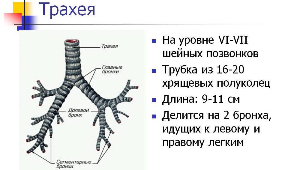 Отже, трахея з’єднують гортань з бронхами, а значить, вона проводить повітря з киснем у легенях. Трахея — це порожнистий орган у вигляді трубки. Довжина її коливається від 8,5 см до 15 см в залежності від фізіологічних особливостей організму. Третя частина цієї трубки розташовується на рівні шиї, інша частина опускається в грудний відділ. В кінці трахея розділяється на 2 бронха на рівні 5-го грудного хребта. Більш детальний опис трахеї: