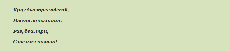 Поки вожатий вимовляє ці слова, дитина повинен оббігти коло, повернутися туди, де він перебував і назвати ім’я поруч сидячої людини і своє ім’я. Дітям цікаво, так як вони намагаються запам’ятати ім’я, щоб не бігати, і добре запам’ятовують імена інших хлопців у загоні.