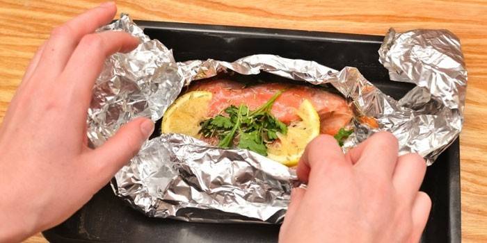 Ситна смачна страва буде доречно на святковому столі. Перевагою рецепту є те, що червона риба у фользі в духовці може запікатися порційно або цілком. Відмінно підійде як бюджетна горбуша, так і делікатесний лосось, сьомга, форель (не переплутайте з річковою фореллю, це білий сорт). Спочатку потрібно обов’язково приправити філе спеціями: білим перцем, розмарином, мускатним горіхом або коріандром.