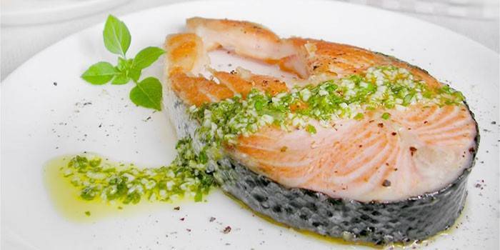 Жирне, ніжне, соковите рибне філе немов обволікається ароматами трав, якщо правильно запекти стейк з лосося в духовці: тому його так люблять гурмани. Добре підходить лимонний перець, сушений кріп і петрушка: можна купити готовий пакетик із сумішшю спецій для рибних страв, особливо якщо ви не впевнені у своїх кулінарних здібностях.