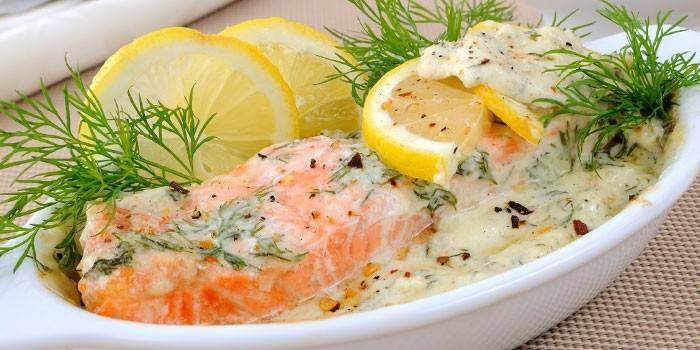 - Надішліть форму з рибою запікатися при температурі 180-190С протягом 25-40 хвилин. Трохи соусу можна залишити, щоб подати окремо.