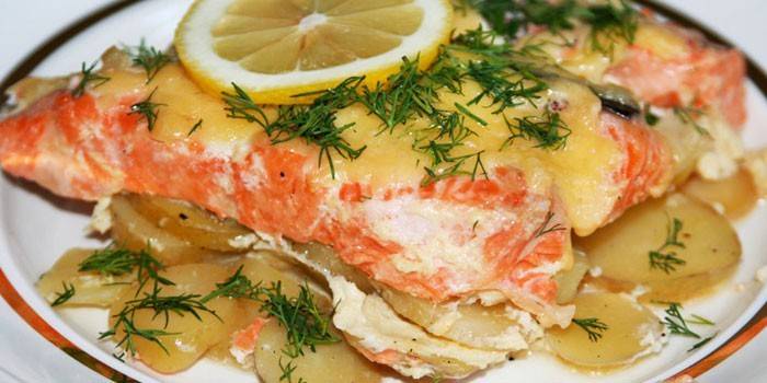 Якщо потрібно швидко приготувати щось ситне, смачне до приходу гостей, то риба, запечена з картоплею – оптимальний варіант. Горбуша – менш дорога представниця сімейства лососевих, але не менш корисна. Потрібно лише нарізати філе шматочками, викласти картоплю, полити соусом і запекти під апетитною сирною скоринкою.