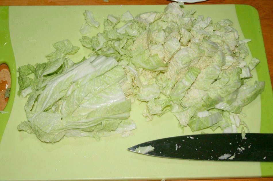 Качан пекінської капусти дрібно шаткуємо. Злегка приминаем.
