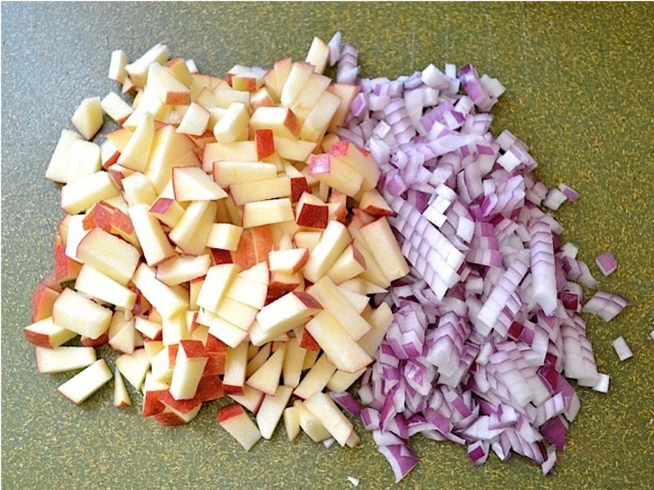 Нарізаємо кубиками голівку червоної цибулі, яблуко, свіжий огірок і два варених яйця. Додаємо 200 грам майонезу і все перемішуємо.