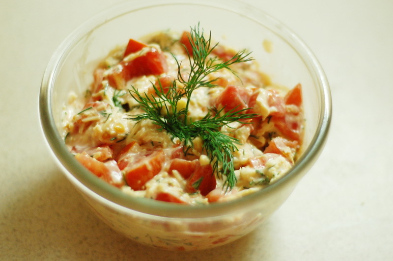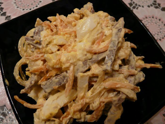 Дуже ніжний і поживний салат. Не вимагає багато часу для приготування. При раптовій появі гостей, виручить вмілу господиню. До того ж сподобається тим, хто віддає перевагу салати без цибулі.