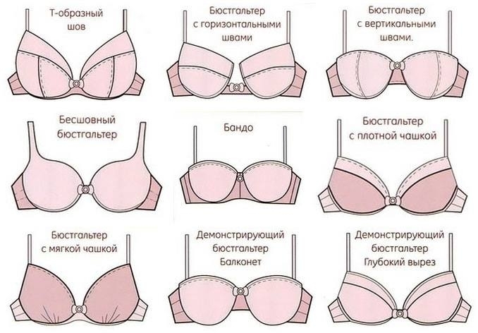 • Пуш-ап або бра – це любимй вигляд молодих дівчат і представниць маленьких грудей. Є три види: перший лише піднімає груди, другий робить її на розмір більше, і останній – значно додає об’єму. Їх не варто постійно носити і особливо варто утриматися від них влітку.