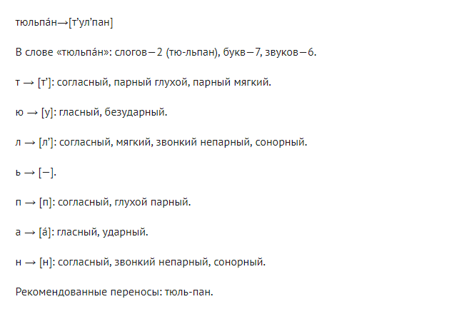 Аналіз слова тюльпан з точки зору фонетики будується на наступних міркуваннях: