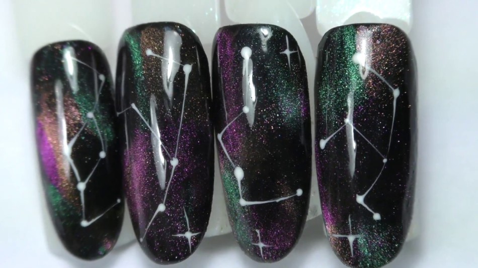 • За допомогою гель-фарби або пасти, виконується звичайне прорисовывание. Наносяться білі зірочки, які з’єднуються дуже тонкими лініями. У підсумку це нагадує щось на зразок сузір’я. Виглядає дизайн досить ефектно, але це не єдиний варіант, який можна створити за допомогою гель-лаків. Дуже часто роблять дизайн імітацією зміїної шкіри. Виконується він дуже просто. Для цього необхідно нанести на ніготь чорну підкладку, після попередньої підготовки.