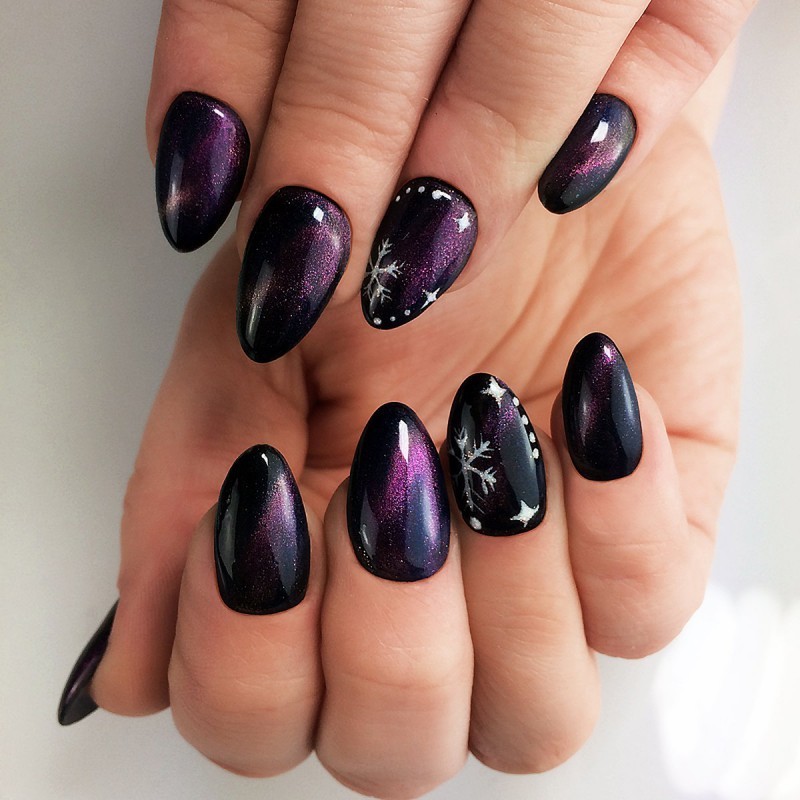 • Для цього необхідно підготувати нігті, нанести підкладку чорного гель-лаку, висушити його. Покрити нігті 3D кішкою або хамелеоном, нанести певний малюнок, за допомогою магніту сформувався прямі або хвилясті лінії.