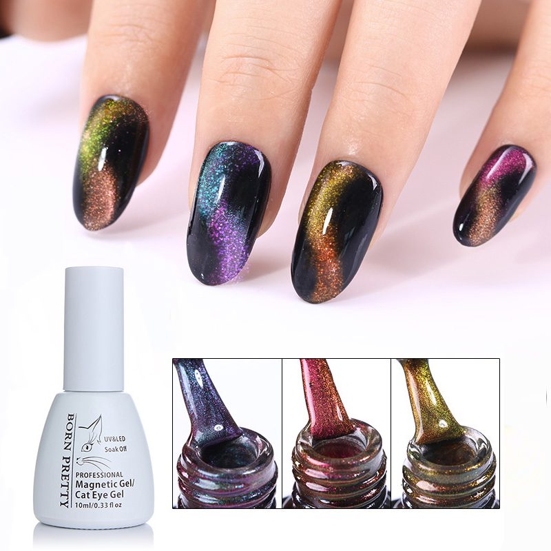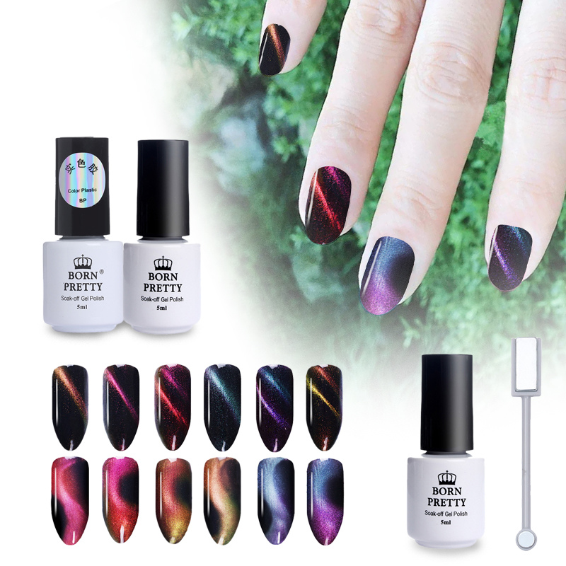 1. Однією з найбільш популярних марок є Борн Преті. Флакончики такого лаку є невеликі по 5 мл, або більші, по 10 мл Відповідно ціна таких флакончиків відрізняється. Маленькі флакони створені як раз для домашніх користувачів, які прагнуть різноманітності в манікюрі, але не готові віддавати величезні гроші за пляшечку з гель-лаком. Палітра не дуже велика, всього 5 злаків, які відрізняються різноманітними переливами магнітних частинок у складі. Для того щоб домогтися несподіваного, цікавого ефекту, а також вигнутих ліній, рекомендуємо купувати додатково магніт. Він відрізняється від звичайної лопаточки, яка продавалася раніше до звичайних лакам котяче око. Тепер на кінчику палички є ще й кружечок, круглий магніт, який створює незвичайні переливи і хвилю. <>