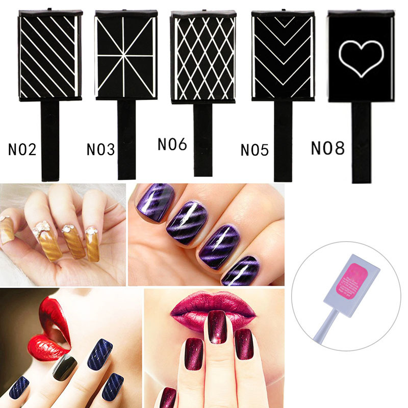 Завдяки такій ручці, вам вдасться намалювати на нігтях вензелі, смуги або хвилясті лінії. Все залежить від ваших фантазій. Якщо ви не хочете так морочитися, можете придбати готові магніти, в яких вирізані смужки, хвилі або різноманітні малюнки. В залежності від цих малюнків ви отримаєте відповідне візерунки на нігтях з магнітних смужок.