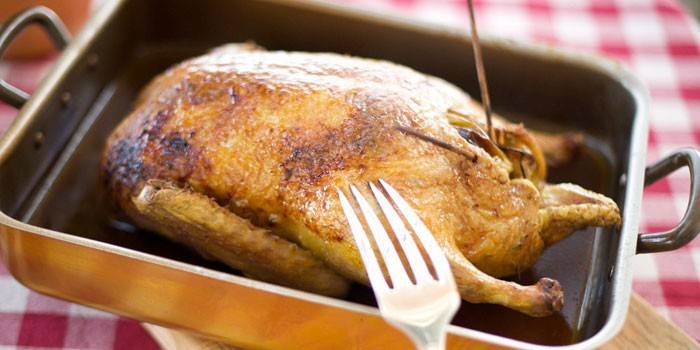 4. Птах зашивається, викладається в гусятницю черевцем вгору, запікається 40 хвилин при 200°С. При цьому потрібно поливати її жиром раз в 15 хвилин.