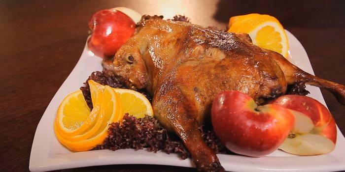 Вишукана, смачна страва, яке стане прикрасою будь-якого святкового столу – качка з рисом і яблуками. Крім основних компонентів, в цьому рецепті використовується алкоголь, родзинки. Як приготувати делікатес правильно? Потрібно закупити заздалегідь всі необхідні продукти (в будь-якому продуктовому магазині), підготувати їх і приступати до створення кулінарного творіння.