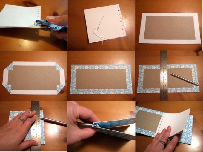 • Згинаємо обкладинку навпіл, а далі ще один згин на 1 см як на фото. Загортаємо серединку всередину і прикріплюємо до неї прошиті листи. Закріплюємо книгу клеєм або прошиваючи ниткою