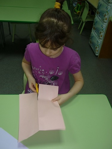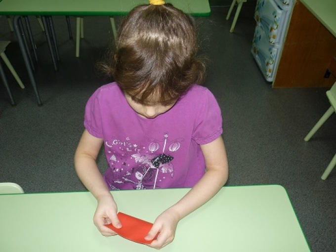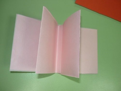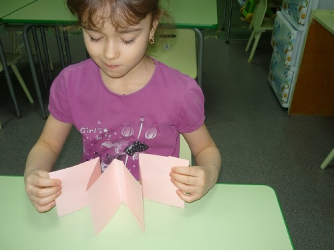 • Згинаємо аркуш стільки разів, скільки повинно вийти сторінок, якщо це картон, то по згину із зворотного боку під лінійку проведіть гострим кінчиком циркуля або зворотною стороною канцелярського ножа
