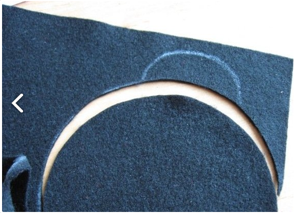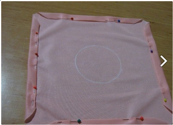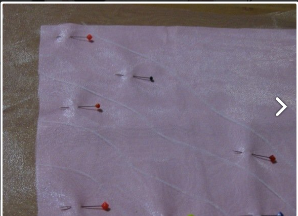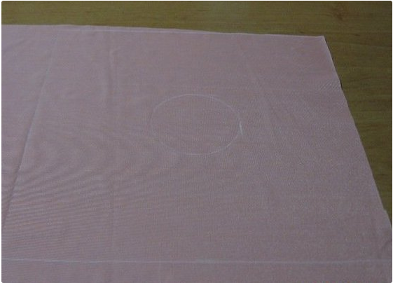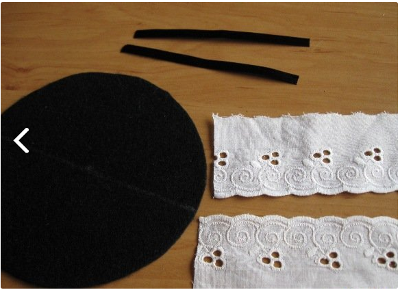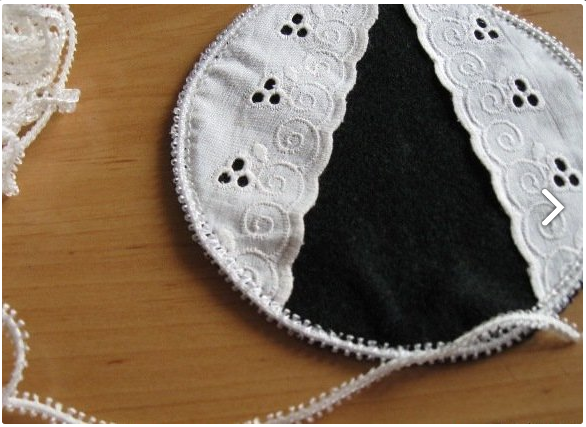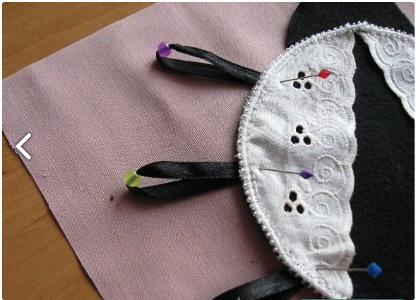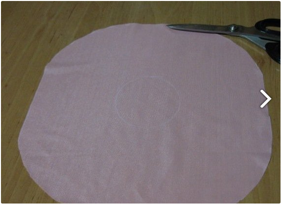 • Знаходимо середину сторінки, кріпимо тканину і пристрочуємо коло 8 см сторінці. В краю затягуємо шнурок