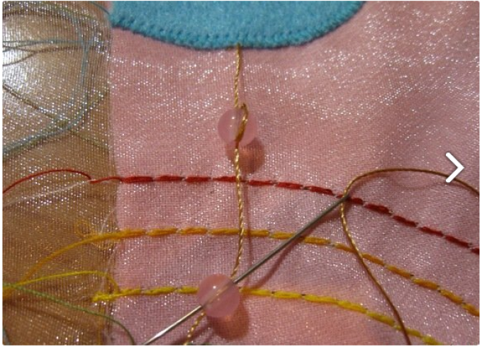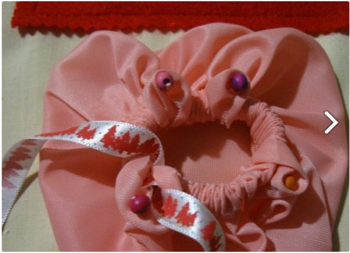 • На другий кінчик стрічки нанизуємо пару великих намистин і пришиваємо як на фото