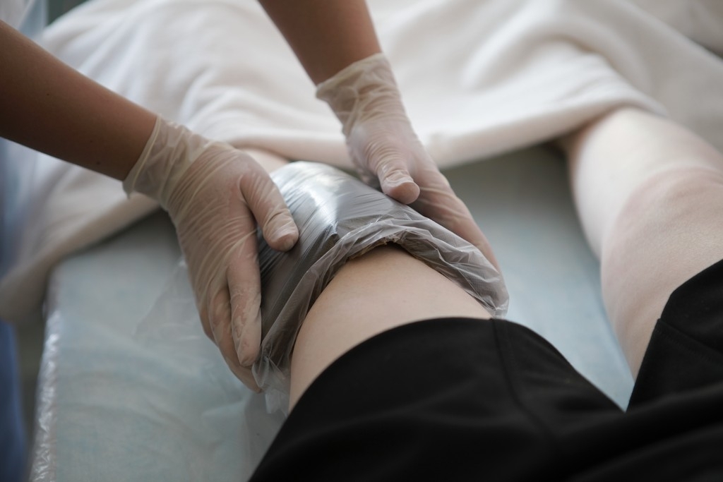 - Зверху накладається шматок целофану і замотується еластичним бинтом. В середньому тривалість такої аплікації становить приблизно 30 хвилин. Зверніть увагу, що ні в якому разі не можна використовувати кольорові клаптики тканини, тому що вони можуть забарвлювати суглоб, а також шкіру, що призведе до виникнення алергічних реакцій.