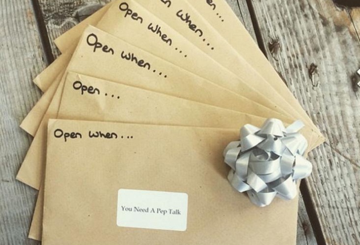 Важливо: Поверх «упаковки» варто написати кілька сонячних фраз для підняття настрою. Щось схоже на: «відкрий, коли немає з ким поговорити», «відкрий, коли сумно», «відкрий, коли тобі тривожно». Щоб максимально розташувати до себе адресата в конверт вкладають миловидні фотографії, пам’ятні речі, невеликі аксесуари.