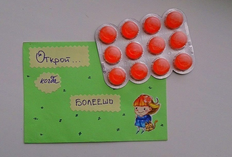 • якщо на ньому фраза зі словами «коли хворієш», значить, всередину покладіть пластинку льодяників від захворювань горла або пакетики з жарознижувальну чаєм;