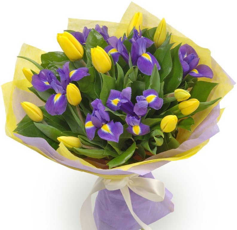 Жовті тюльпани і фіолетові іриси створюють контраст двох кольорів і ідеально вписуються в інтер’єр кімнати. Такі букети покращують настрій і додають бадьорості і сил.
