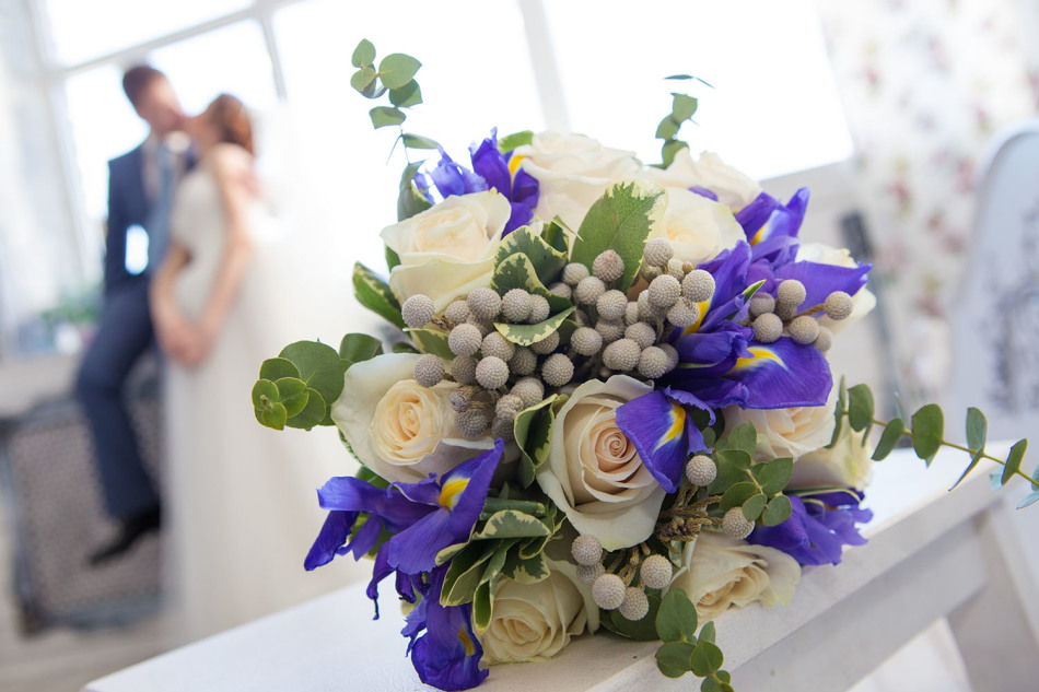 Оригінальну композицію для нареченої, якщо вона хоче мати нестандартний весільний букет, можна скласти з синіх ірисів і яскравих червоних півоній або троянд.