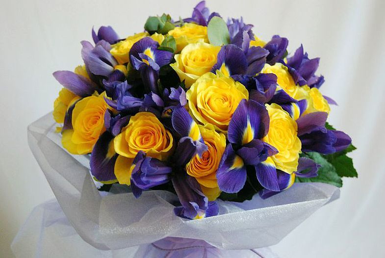 В букет з троянд і ірисів іриси можуть грати головну, так і другорядну роль. Так вони можуть підкреслювати красу троянд і нарівні з цими красунями виступати головними героями букета або бути зовсім непомітними. Якщо ви хочете подарувати букет яскравою жінці — виберіть троянди насиченого кольору і такого ж насиченого кольору іриси.