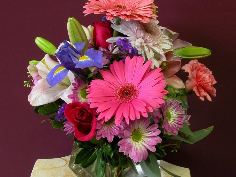 Гербери дуже яскраві квіти. Вони здатні прикрасити будь-який букет. На тлі гербер іриси кілька губляться, але в цілому букет виглядає дуже привабливо.