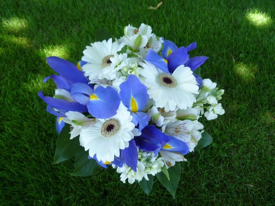 У поєднанні з білими герберами іриси не губляться і на них зосереджений головний акцент.