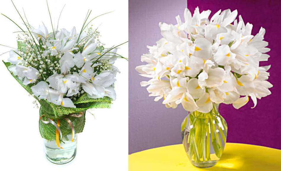 Якщо букет складений з одних білих ірисів, то виглядає він дещо нудно. Тому в такий букет додають або зелене листя, або інші більш яскраві квіти.