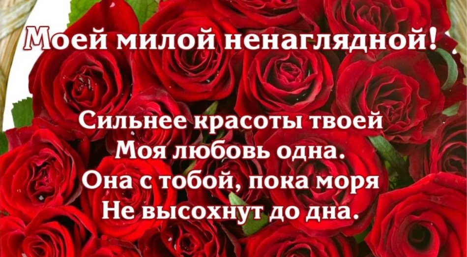 - Дорога, мила моя дружина. В цей прекрасний сонячний день, день твого ювілею, я хочу побажати тобі величезного жіночого щастя! Щоб перед тобою відкривалися нові горизонти, здавалися будь-які перешкоди. Ти для мене — ідеал краси і порядності, добра, ніжна, турботлива, чуйна, справжня і головне — МОЯ! Мила, будь щаслива, а я в свою чергу зроблю все для цього.