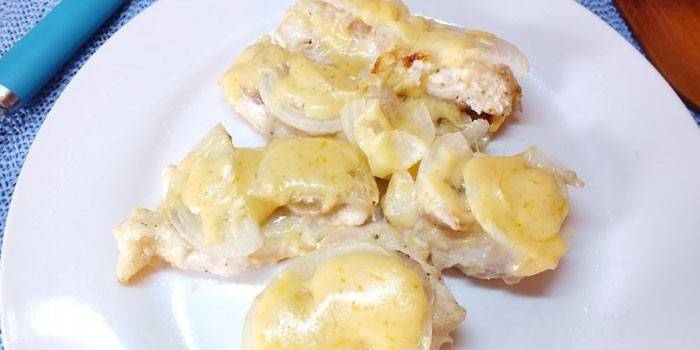 Запечене куряче філе в мультиварці прекрасно буде виглядати на святковому столі. Готується воно з томатами та цибулею під сирною скоринкою, що надає соковитості м’яса. У рецепті вказано, що у страву слід додавати приправа до курки, але ви можете використовувати будь-які спеції, які вам подобаються.