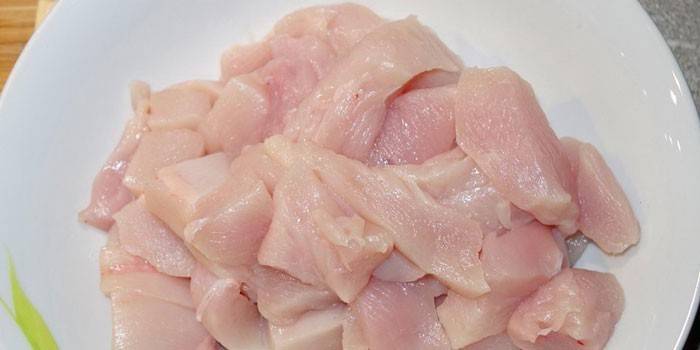 - Філе промийте. Обсушіть його, приберіть жир, плівки. Поріжте маленькими однаковими шматочками.