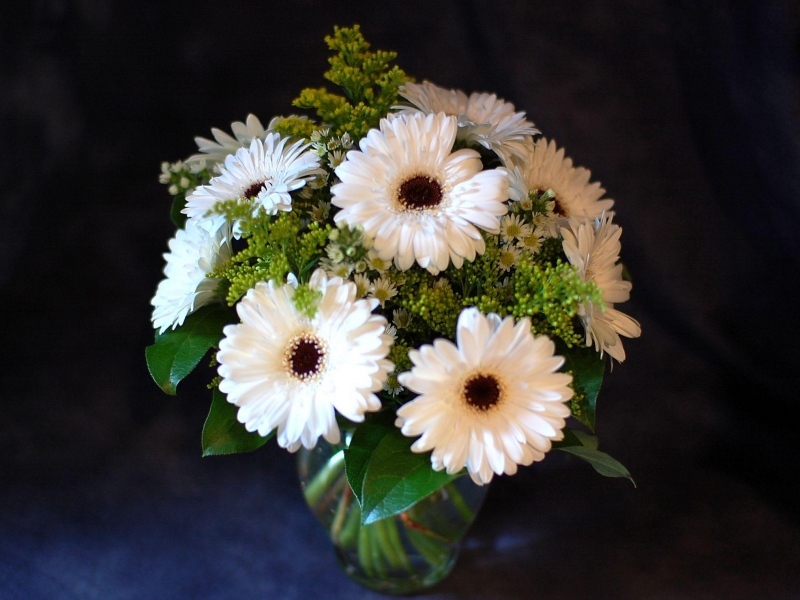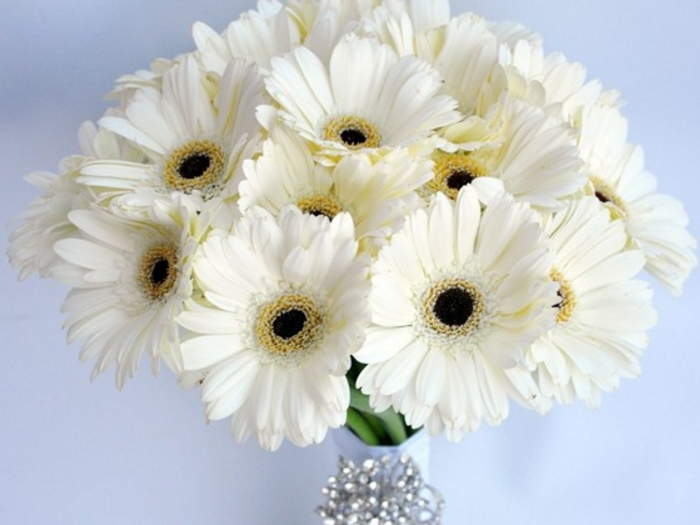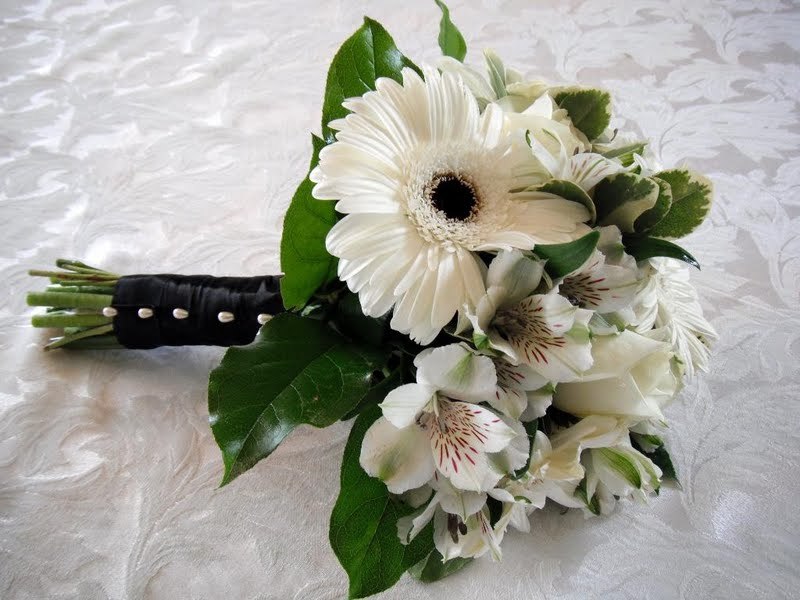 Білі квіти, оповиті неповторним сяйвом, з чорними серцевинами особливо стильно і елегантно виглядають як букета нареченої. Щоб додати гламуру такої композиції, її можна прикрасити стразами, яскравими стрічками або вишуканими перлинами.