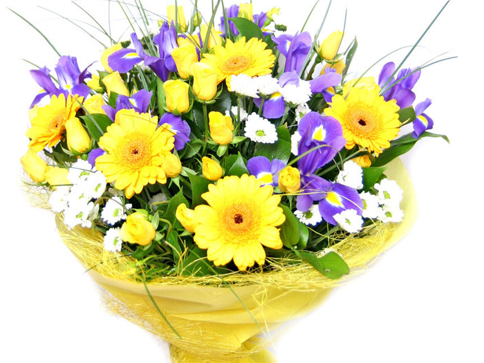 Композиція з жовтих гербер та ірисів