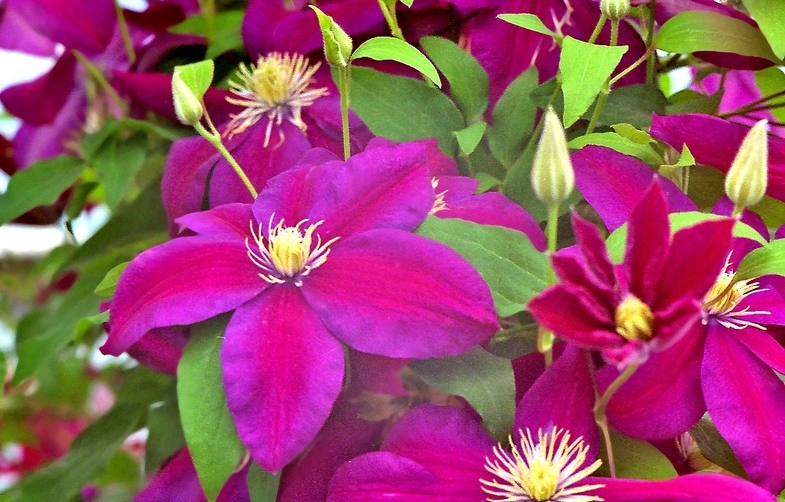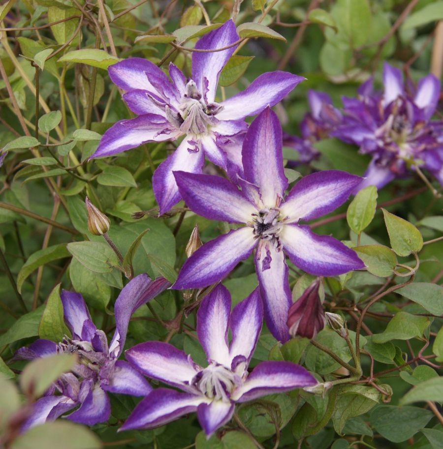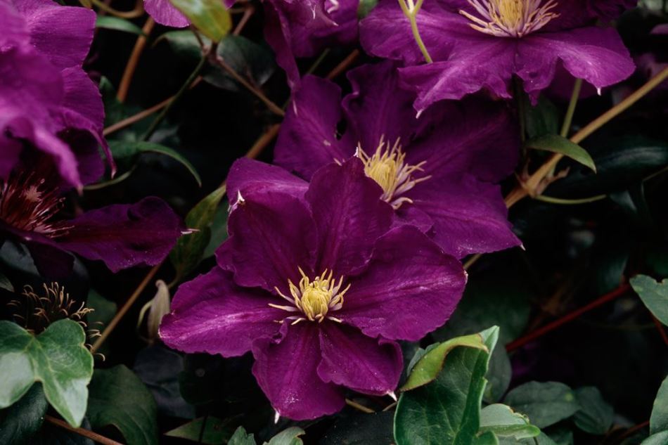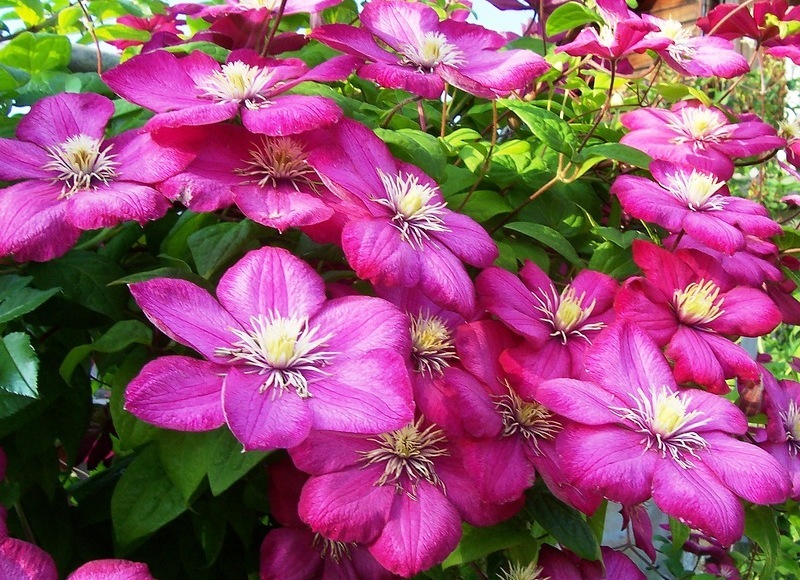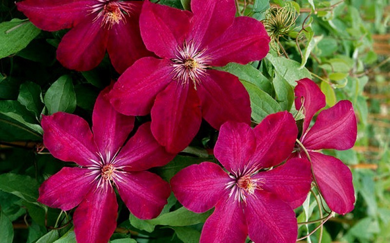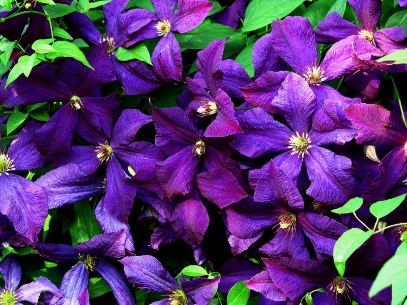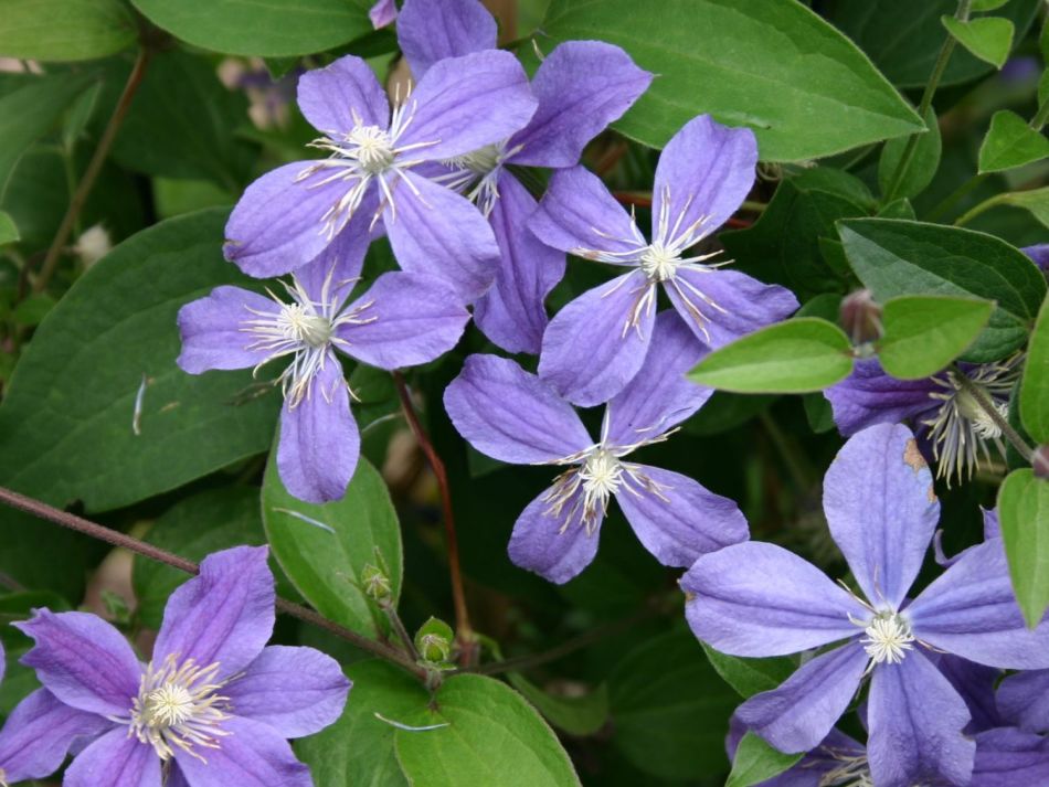 • Жакмана. Пишна ліана з великими квітками і добре розвиненими коренями. Квіти аромату не мають, зате вони мають синьо-фіолетовими або пурпуровими тонами. Клематис цього виду рясно цвіте, а перед зимою обрізається.