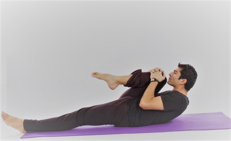 • Руки сцепляем попереду себе, беремо ними одне коліно і підтягуємо як можна ближче до живота, дістаємо підборіддям коліно. Потім те ж саме робимо з іншим коліном.