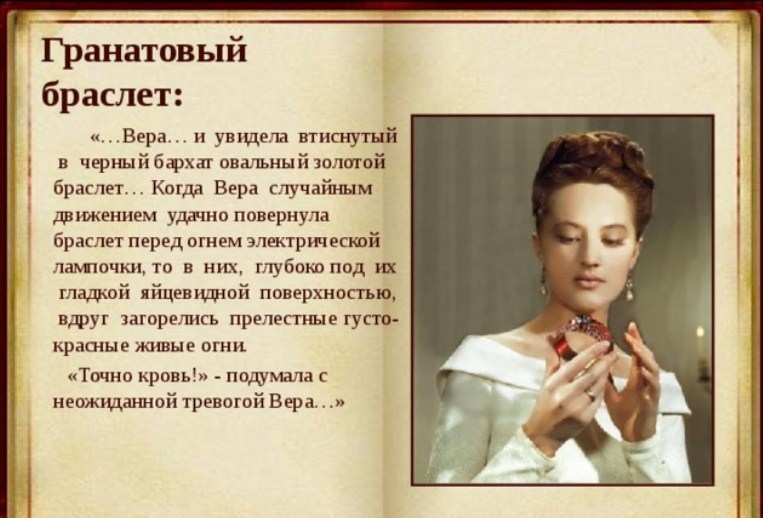 - З допомогою гранатового браслета, чиновник хотів показати свою відданість і вогонь, переповнювали його серце. В цей подарунок він вклав всю свою любов. Ця була ще одна нагода доторкнутися до рук княгині.