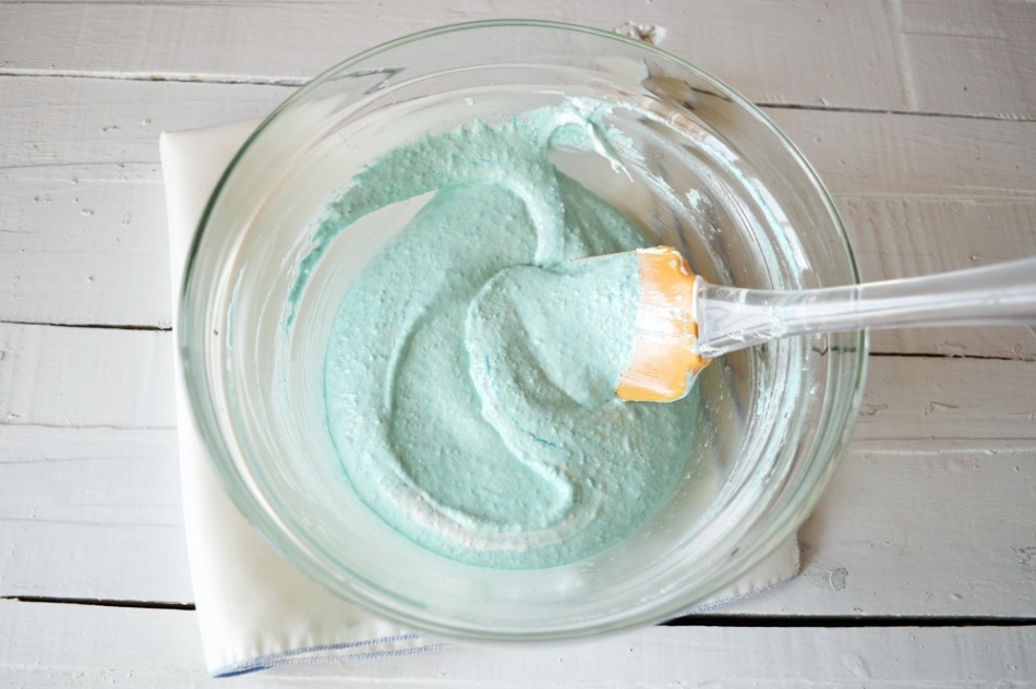 Добавки для фарбування включаються до складу збитих щільних білків перш борошна. Білки з барвниками помішуйте неквапливими рухами до центру від країв. І тільки в цей час поступово додавайте борошно – це допомагає всім компонентам розподілитися рівномірно.